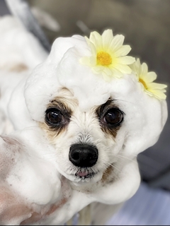やほーい 茜ですん そういえば! いっちゃんのトリミング写真 載せてなかった📸笑 じゃん🤲🏾 お花なんかつけちゃって🌼 なんて可愛いんでしょうか💭💘 今回の写真は素晴らしい👏🏾💖 いっちゃんの可愛さが出ている🥰 という事で シニアは本日も、出勤ですん👩🏾🦼💨 🌷今日の女の子🌷 まひろ あかり あかね みいな